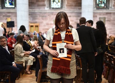 A mourner wearing a Hogwarts scarf holds the order of service for the funeral for journalist Lyra McKee at St Annes Cathedral in Belfast. Pic: Charles McQuillan/Getty Images