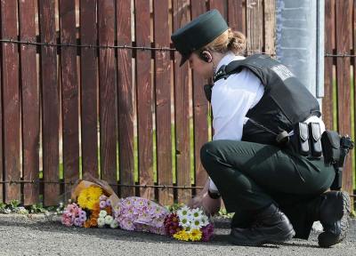 A police officer lays flowers at the scene in Derry, Northern Ireland, following the death of 29-year-old journalist Lyra McKee who was shot and killed when guns were fired and petrol bombs were thrown in what police are treating as a "terrorist incident" Pic: Brian Lawless/PA Wire