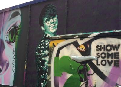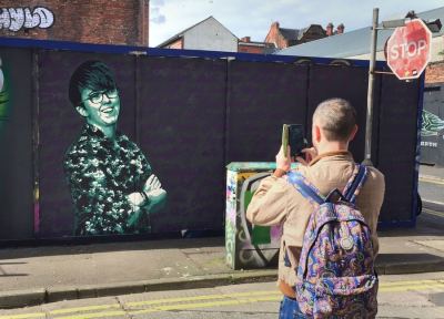 If you want to see it, it has been painted opposite the Sunflower Pub, on Kent Street, nearby to St Anne's Cathedral, where her funeral was held.