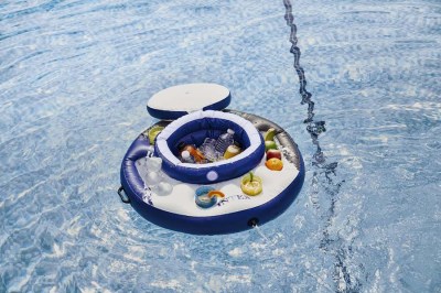 No need to get out of the pool to enjoy a refreshing cold drink! 3 air chambers keep the cooler stable. Durable handles and grab rope. 5 built-in cup holders and 2 trays. Holds up to 30 cans and ice. Includes Repair Patch. Approx. 84 x 29cm.