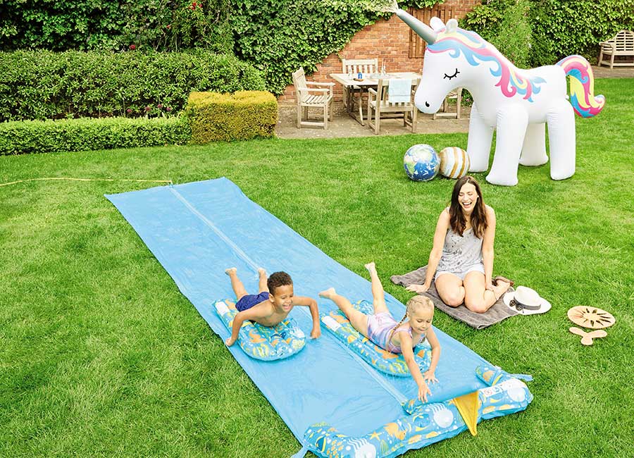 2-lane racing with fine spray water jets for optimum sliding. Water-filled stopper to cushion the slide. Includes 2 Surf Riders, Flag, 4 Pegs and Garden Hose Connector. Available in blue/red or turquoise. Water Slide approx. 4.9 x 1.4m. Suitable for ages 4+ years.