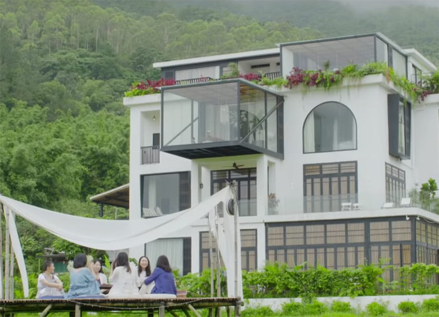 The architecture of the building is superb, with floor-to-ceiling windows and glass boxes overlooking the surrounding paddy fields and countryside, it looks like a dream pad.