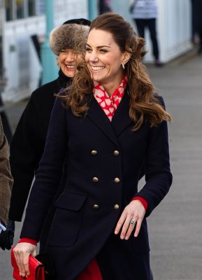 Kate wore a red Zara dress that matched her 'heart' motif scarf perfectly Pic: Rex