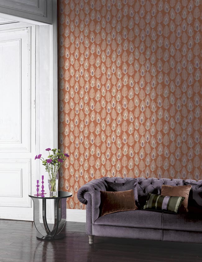 Make a statement or feature wall in your space with some printed wall paper, in the muted orange shade it is the perfect partner to rich, jewel tones, while the simple geo-pattern adds a global nomad feel.