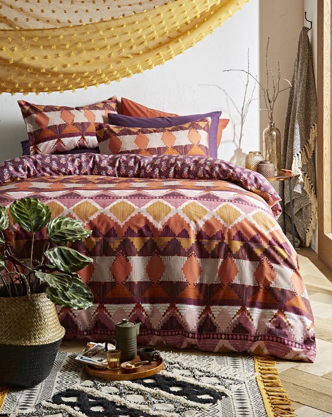 Get that casual vacay-vibe with a printed duvet cover that gives a chilled-out vibe. And for all out texture mix in rugs made of macramé and wicker plant baskets.