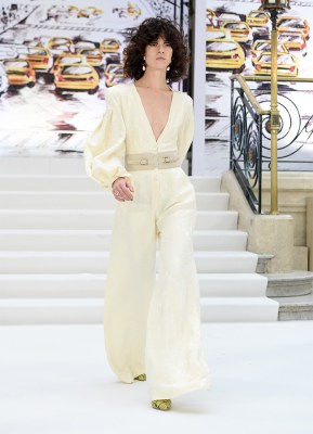 A stalwart on the Paul Costelloe catwalk, evening-wear was represented in in luxurious silk jacquards. With a silver daisy print puff sleeve midi dress and a bright poppy jumpsuit taking florals from daytime to after-dark.
