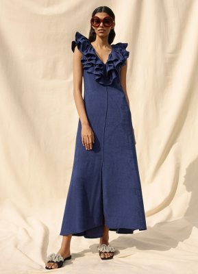 Flamboyant evening wear, gauzy midi day dresses, and subtly tailoring. The collection features new sustainably sourced materials including; Circulose, produced from recycled textiles and Renu, a recycled polyester.