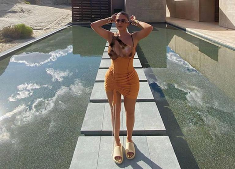 Kylie paired the orange and tan ruched, one-shoulder midi dress with matching hued gold bangles and earrings, statement wrap-around sunglasses and tan, comfortable-looking slides.