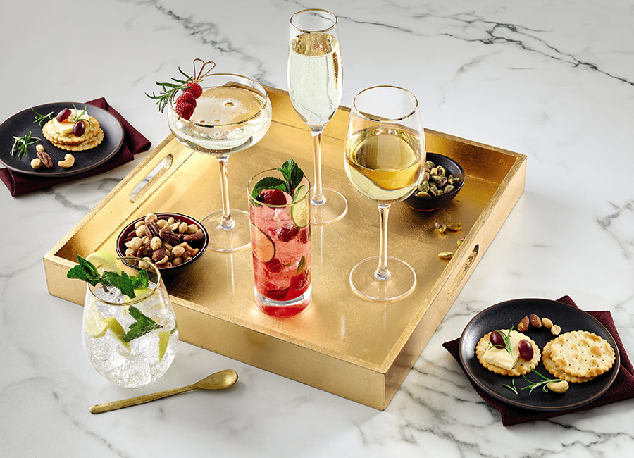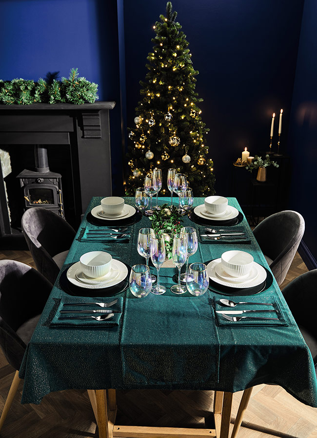 Don't miss the tableware either — sparkling table cloths in red, grey, gold or green to match your colour scheme, as well as glasses, trays, placemats, centre pieces, candle holders and more, that are all perfectly coordinated.
