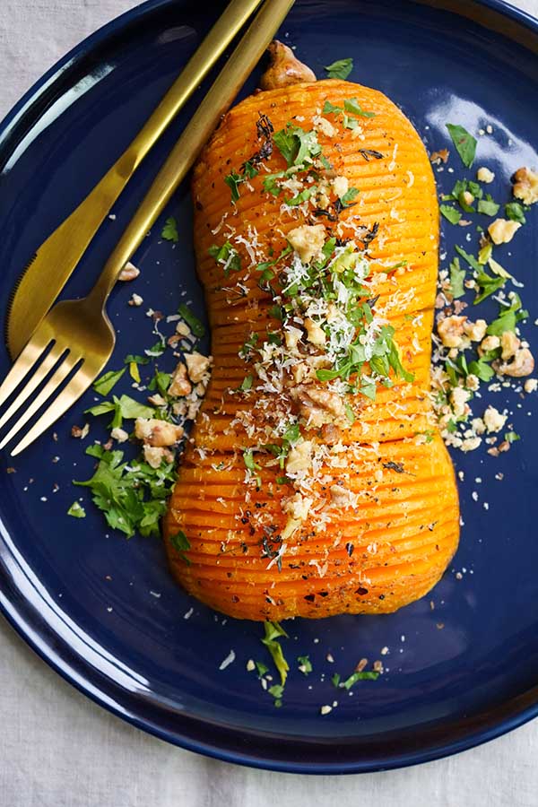 - Remove the squash from the oven and let it cool slightly before carefully transferring to a serving plate. Before serving, finish with the roughly chopped parsley, crushed walnuts and grated vegan parmesan.