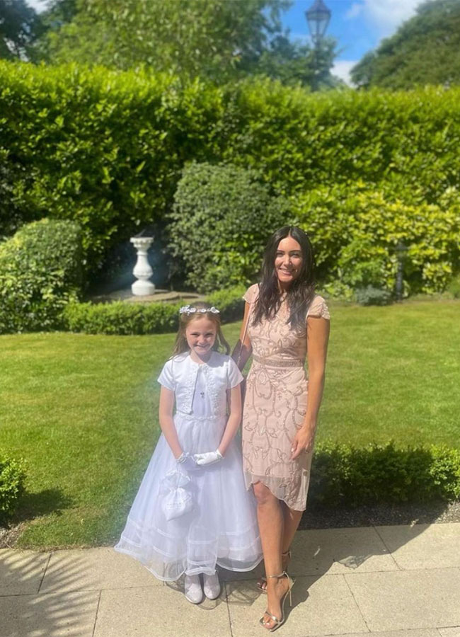 While it was Gia's day to shine, her proud mum looked amazing standing beside her sweet girl in an exquisite beaded dress that ,while intricate and stunning, didn't distract from her little one's cute communion day outfit.