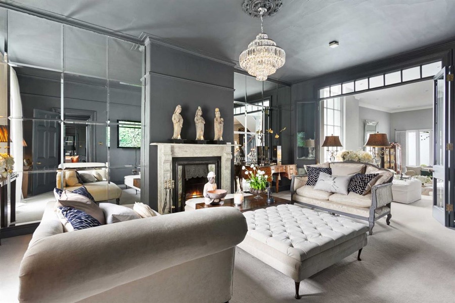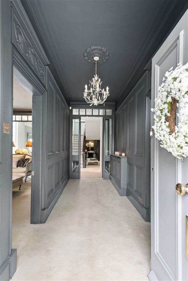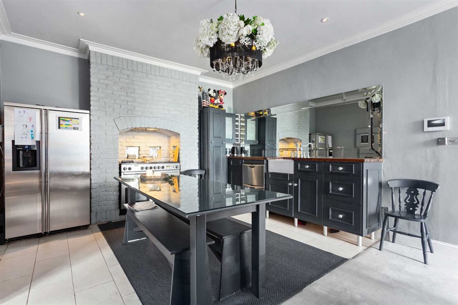 Upon entering the front door, there are two grand reception rooms on either side of the hallway, ideal for entertaining family and friends. The interior design is modern with classic touches, the walls painted a dark grey colour throughout.