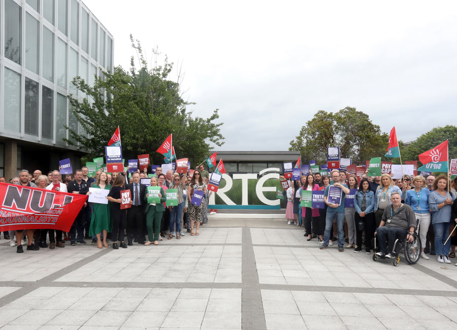 Level of unrest at RTÉ is laid bare, as more than 100 staff at Montrose protest against the inner workings of the State broadcaster. One speaker rails against 'rockstar fees' for top talent.