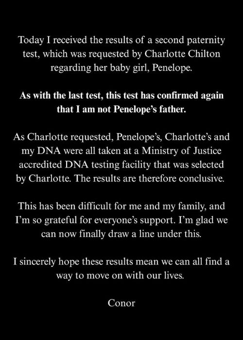 Concluding again that Conor was not the father, the singer made a statement on his social media about the results and how difficult this has been for himself and his family. 'As with the last test, this test has confirmed again that I am not Penelope's father.