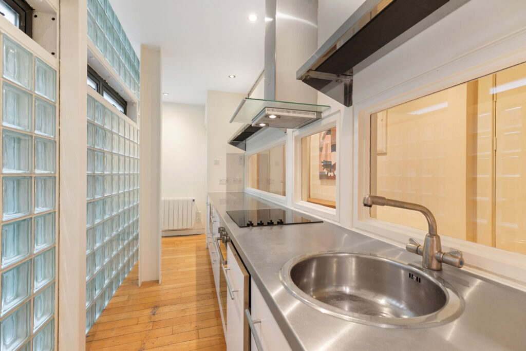 Galley in style, the kitchen is washed in diffuse, natural light thanks to the use of glass blocks in part of its exterior wall. It has fashionable stainless-steel countertops.