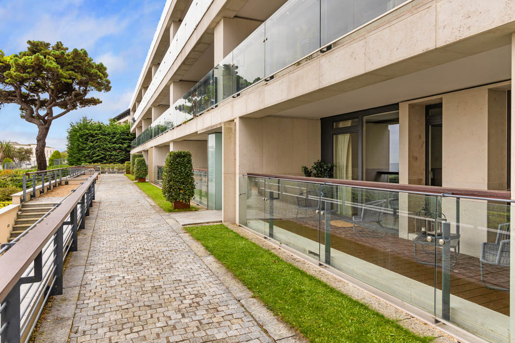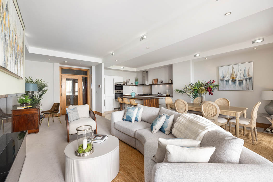 Set on the ground floor, it has high ceilings, and the living space is washed in light thanks to its floor-to-ceiling glazing and sea views.