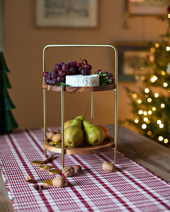 A cheese plate or home-made bites on this two-tiered timber and metal frame stand, €25, from Helen James’ Considered range at Dunnes Stores.